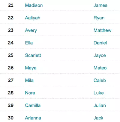 下面是2017年度热度前五十的男孩女孩英文名完整榜单