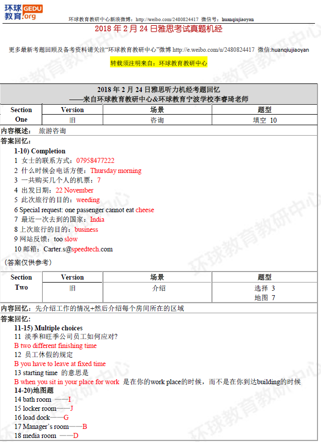 环球教育教研中心的名师们此次为大家送上2018年2月24日雅思听力考试回忆及答案,希望对大家备考雅思有所帮助!
