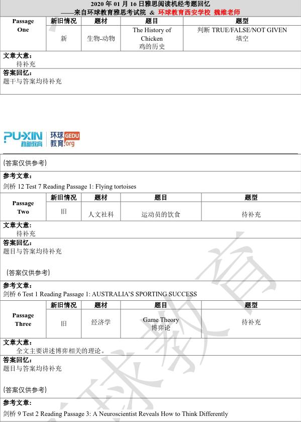 2020年1月16日雅思阅读考试真题机经