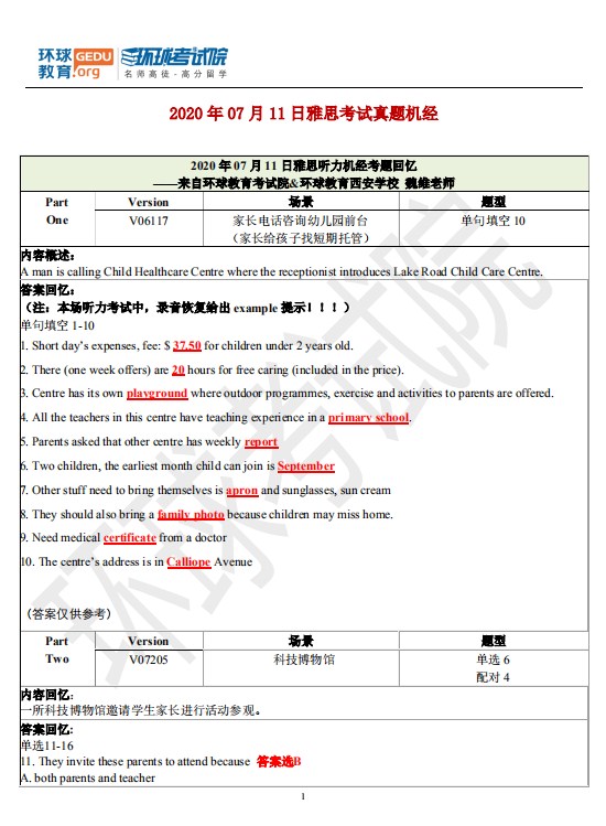 环球教育教研中心的名师们此次为大家送上2020年7月11日雅思考试听力真题机经,希望对大家雅思备考有所帮助!